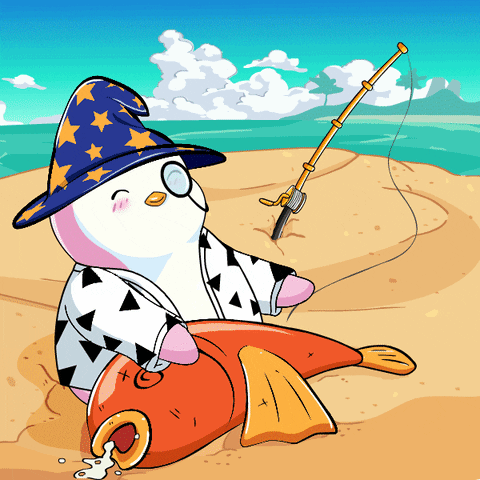 A happy Pudgy Penguin, wearing a wizard hat and monocle, proudly displays its huge fish catch on the beach.