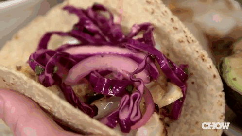 A delicious fish taco being prepared, topped with purple cabbage, avocado, and a dollop of sour cream.