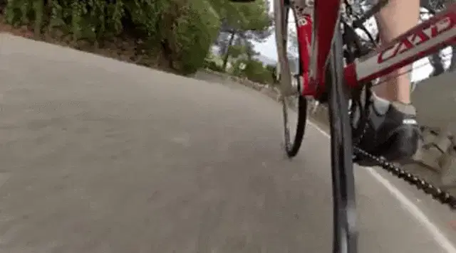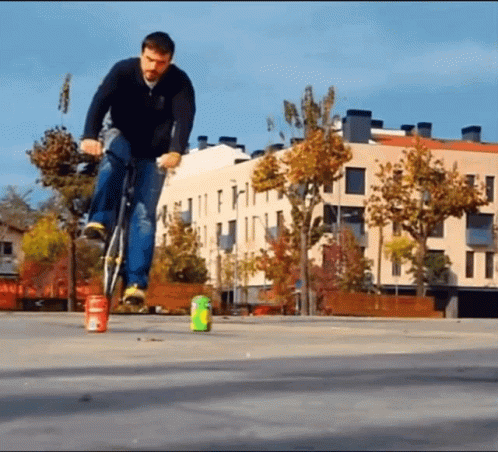 Man performs a fixie skid trick on a bicycle, balancing near soda cans in an outdoor plaza.