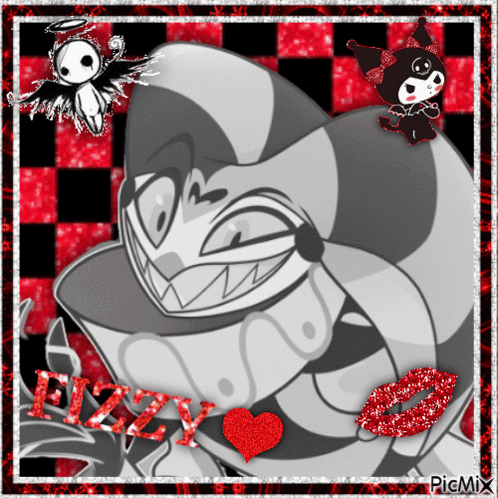 Digital fan art featuring Fizzarolli from Helluva Boss, with a red and black checkerboard background.