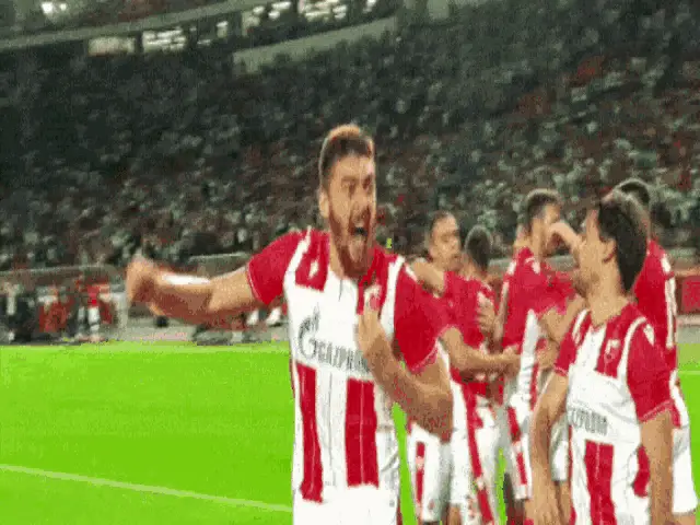 El Fardu Ben celebrates a goal for FK Crvena Zvezda, wearing his red and white striped jersey.
