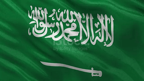 The national flag of Saudi Arabia, featuring the Shahada (Islamic creed) and a sword, waves proudly.