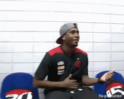 Man in a black Flamengo shirt and a grey hat, smiling and gesturing.