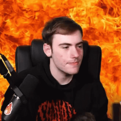Sapnap holds his cat, smiling at the camera against a dramatic fiery background.