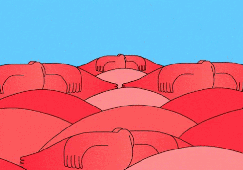 Two cartoon flamingos emerge from a sea of red shapes to form a heart with their necks.