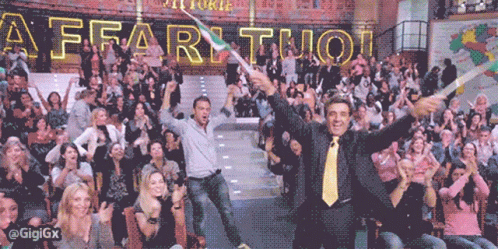 Flavio Insinna enthusiastically celebrates on the set of the Italian game show Affari Tuoi, waving flags.