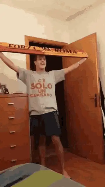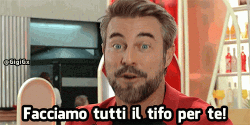 Flavio Montrucchio, wearing a red shirt, says "We're all rooting for you!" and winks, offering encouragement.