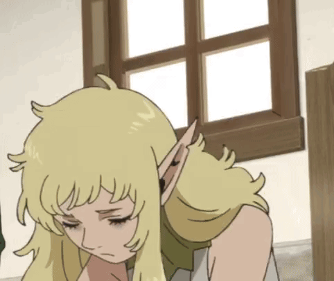 a cartoon girl with blonde hair and elf ears is looking down in front of a window .