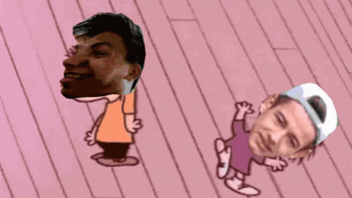 Kirill and Makar's faces superimposed on cartoon characters dancing and flexing on a pink floor.