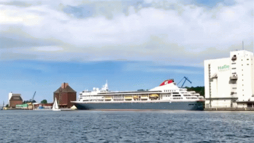 A large cruise ship is docked in Flensburg Harbor, Germany, with a white HaGe building and a sailboat nearby.