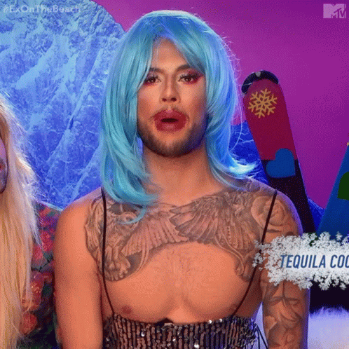 Niall Aslam in a blue wig and sequin top, with a chest tattoo and a 'Tequila Cocktail' sign.