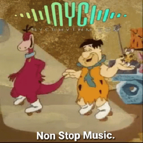 Fred Flintstone and a dinosaur roller skating to 'Non Stop Music' in a vibrant NYC-themed cartoon.