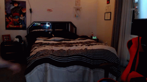 Streamer Paps performs a dynamic flip onto his bed, then smiles and points at the camera for Hiu.