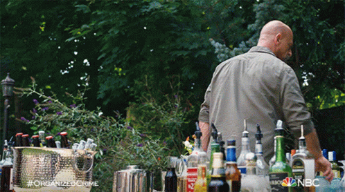 Christopher Meloni as Elliot Stabler shows off his bartending skills, juggling a cup at an outdoor bar setup.