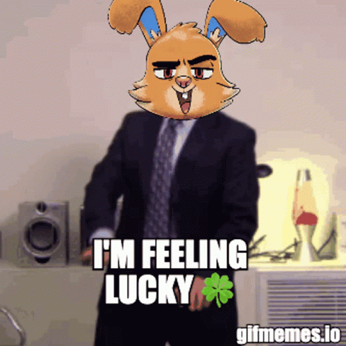A cartoon rabbit head on a person in a suit dances, expressing 'I'm Feeling Lucky' with a shamrock.