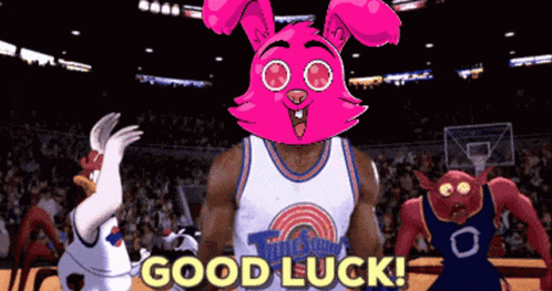 Flippin Rabbits Lucky Rabbit meme wishing good luck on the basketball court, featuring a pink bunny.