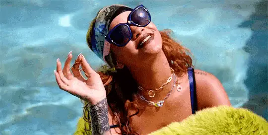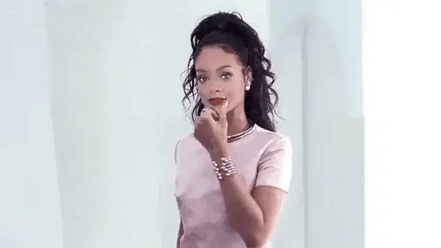 Rihanna smiles charmingly and touches her hair in a luxurious bathroom setting.
