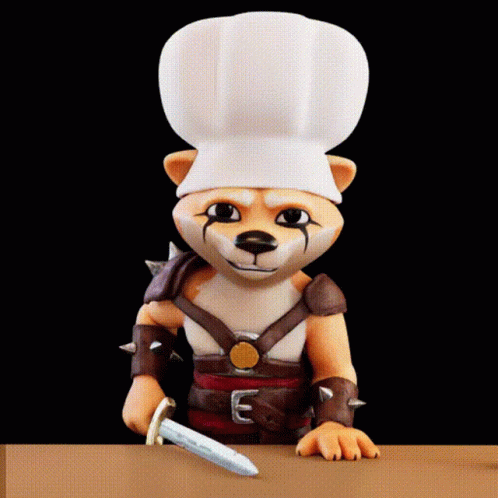 Floki, the chef warrior dog, skillfully chops an orange with a sword.