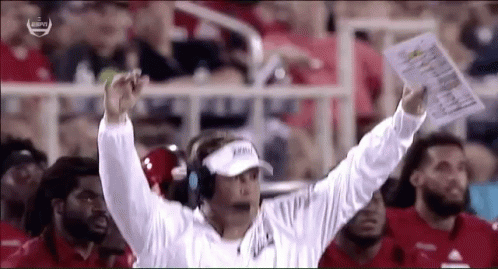 Lane Kiffin, coach for Florida Atlantic (FAU) Football, celebrates on the sidelines, raising his arms in excitement.