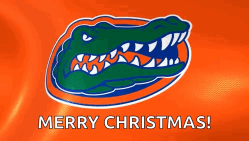The iconic Florida Gators logo on an orange waving flag, wishing everyone a Merry Christmas.