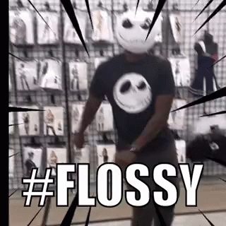 A person in a Jack Skellington costume performs the popular floss dance in a store aisle.