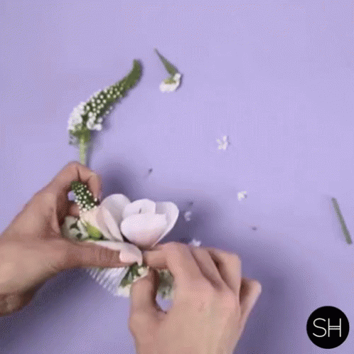 Crafting a beautiful flower comb accessory by meticulously attaching fresh flowers and foliage to a hair comb.