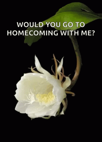 A white flower blooming with a "Would you go to homecoming with me?" proposal message.