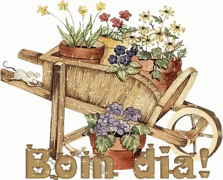 A wheelbarrow filled with vibrant potted plants, with 'Bom Dia' text appearing on screen.