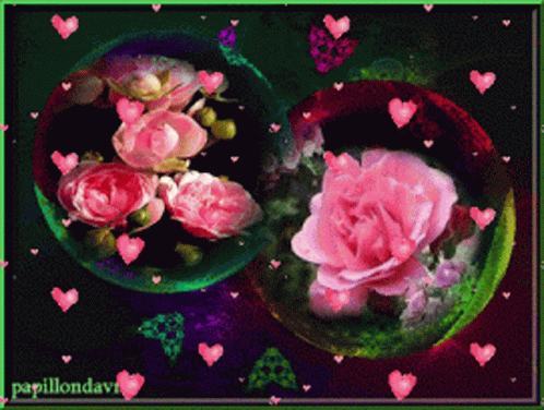 Two circular frames filled with beautiful pink roses, surrounded by floating pink hearts in an animated display.