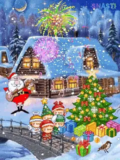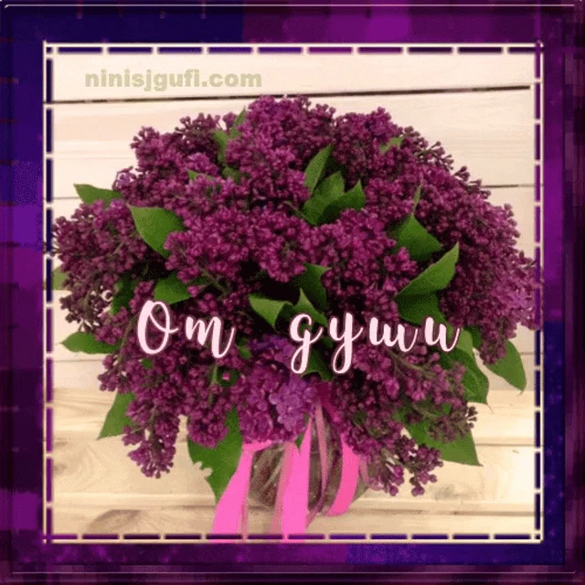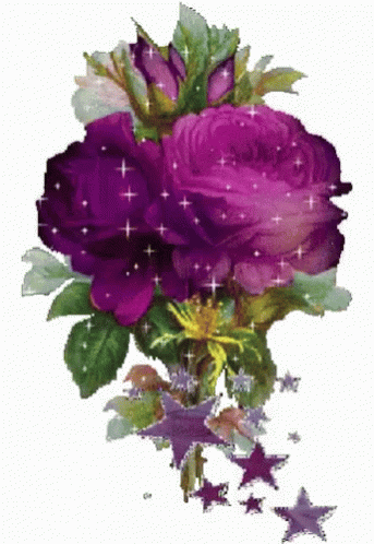 A vibrant animation of purple flowers with green leaves, adorned with sparkling glitter and stars.