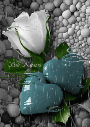 A beautiful white rose and two blue hearts are depicted under gentle rain, with a background of grey pebbles.