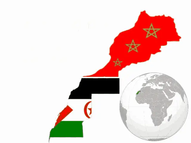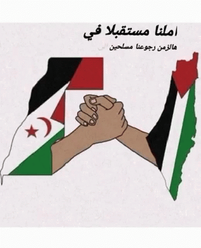 Image depicting the flags of Palestine and Western Sahara, with clasped hands symbolizing unity and hope for a return to homeland.