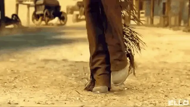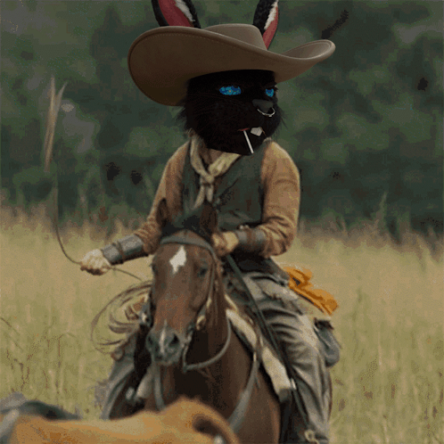 A black rabbit from Fluf World, wearing a cowboy hat, rides a horse and holds a lasso in a grassy field.