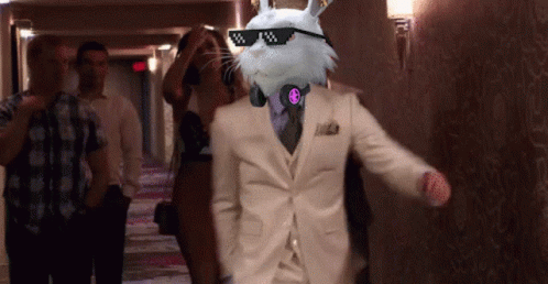 The Fluf character, wearing sunglasses and a stylish suit, confidently walks down a hotel hallway.