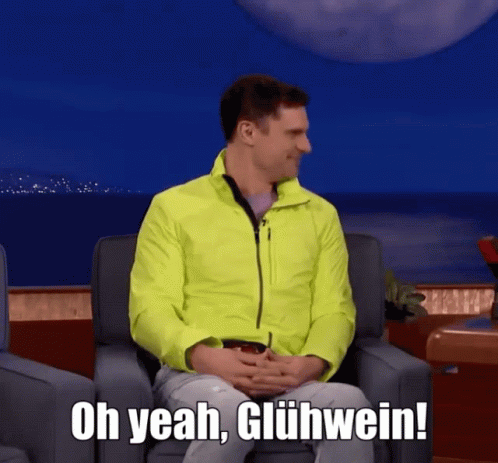 Flula Borg enthusiastically exclaims 'Oh yeah, Glühwein!' while sitting in a bright yellow jacket.