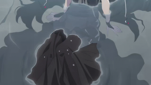 Ophelia from Fluorite Eyes Song in a black dress, submerged in a pool with a melancholic expression.