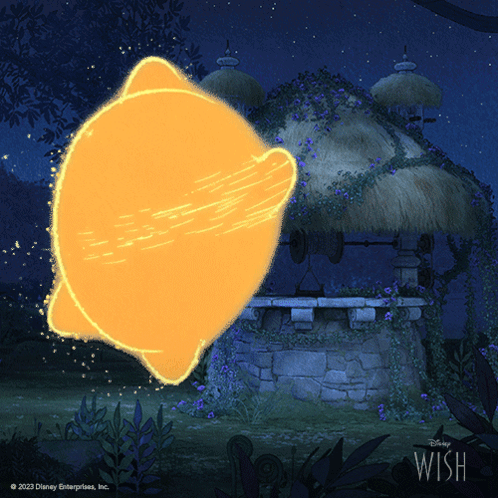 Disney's Wish movie character Star, a glowing yellow entity, floats and smiles in a magical forest.