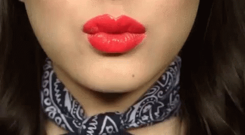 A woman with red lipstick blows a flying kiss, making a 'muah' gesture, possibly for a congratulation.