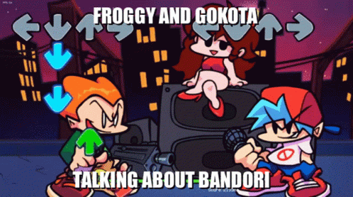 Froggy and Gokota from Friday Night Funkin' discussing Bandori, featuring characters Pico and Boyfriend.