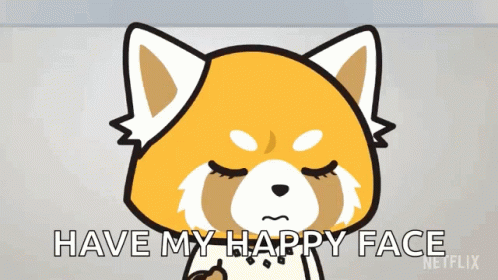 Retsuko from Aggretsuko transforms her expression to a sparkling happy face, with the caption 'HAVE MY HAPPY FACE'.