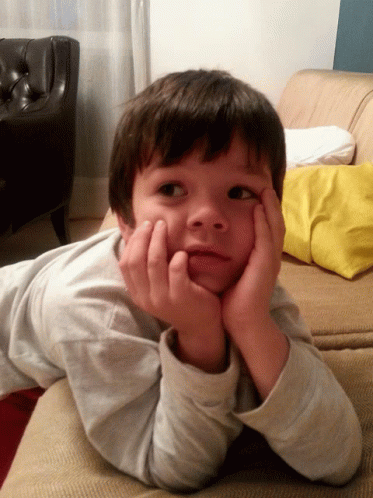 Cute boy Fofo resting on a couch with his head in his hands, looking up with a sweet expression.