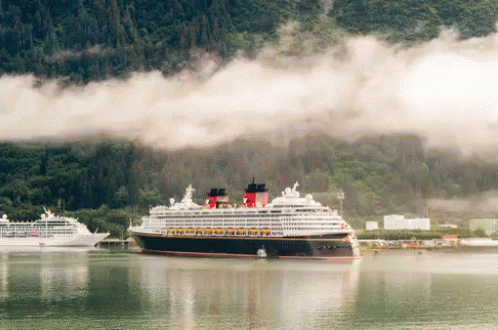 A Disney cruise ship docked in a beautiful, foggy harbor.