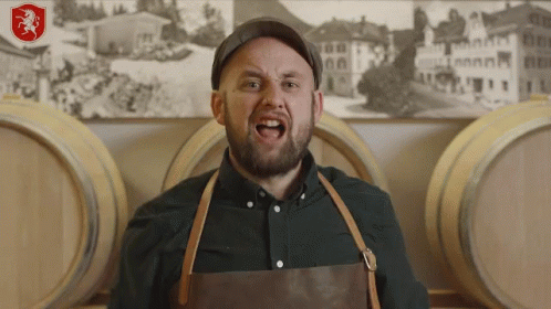 An angry man from Fohrenburger Fohra, wearing an apron and cap, raises a hammer in a brewery.
