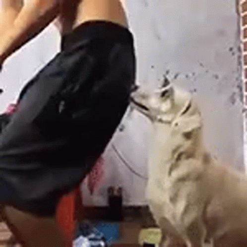 Folkloreperry Prismfancy features a man and a white dog playfully interacting with his leg.
