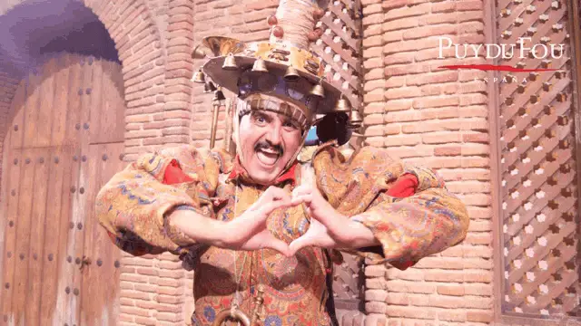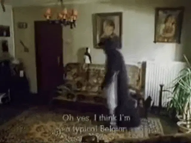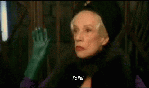 An older woman in a purple coat and green gloves exclaims 'Folle!' with a dramatic gesture.