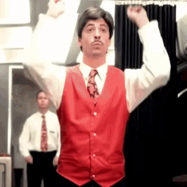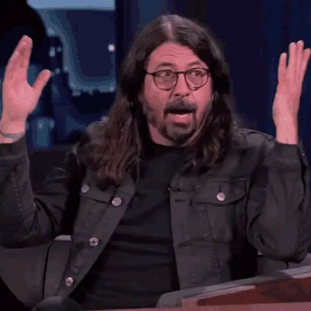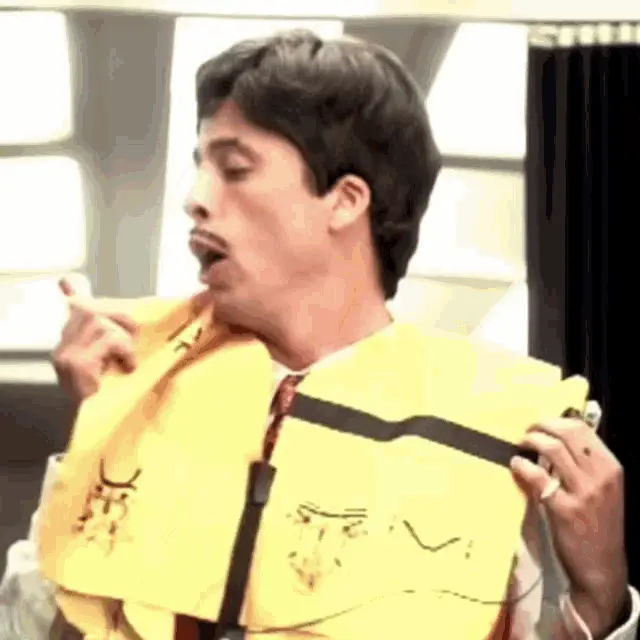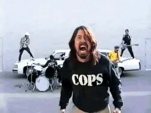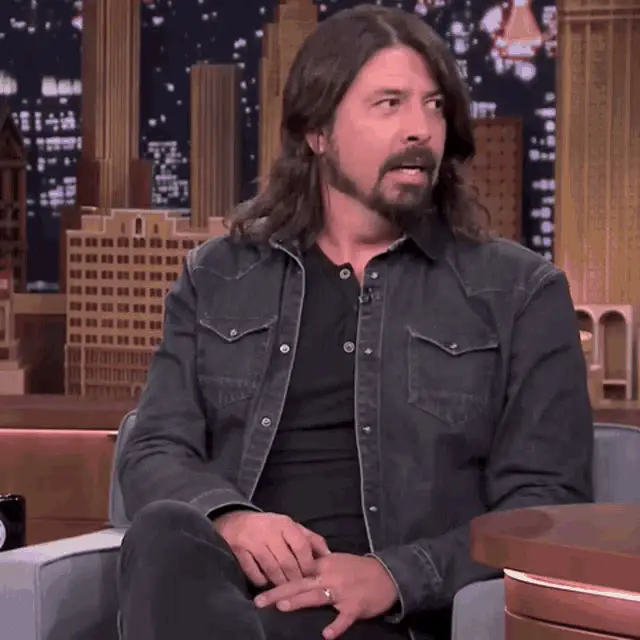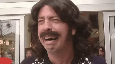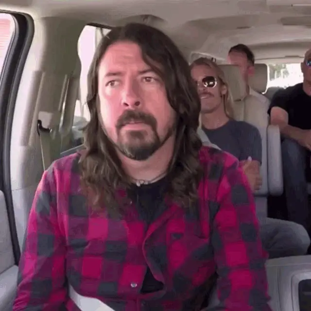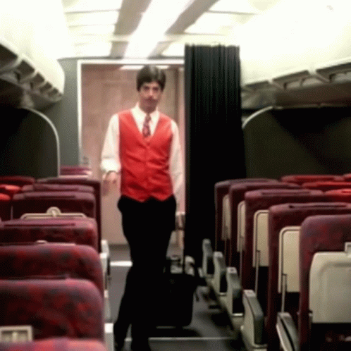 Dave Grohl, dressed as a flight attendant, walks through an airplane cabin in the iconic Foo Fighters 'Learn To Fly' music video.