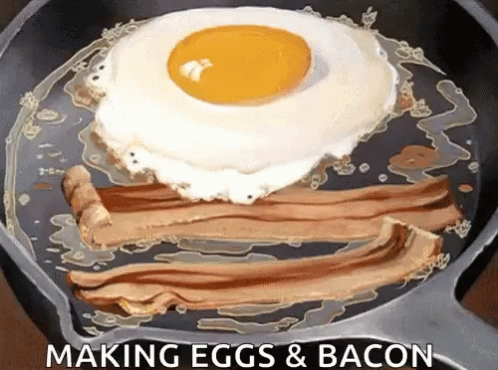 An egg and two strips of bacon sizzle in a hot skillet, preparing a classic breakfast meal.