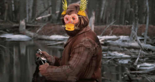 Foodmasku showcases a creative food mask featuring pineapples, donuts, and a cheeseburger on a person's face in an outdoor setting.