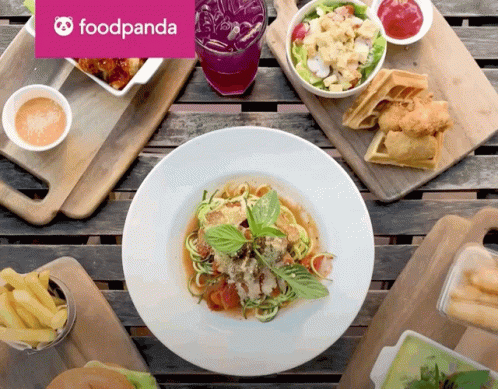 A variety of delicious dishes, including zucchini pasta and waffles, are prepared and served, featuring Foodpanda delivery.