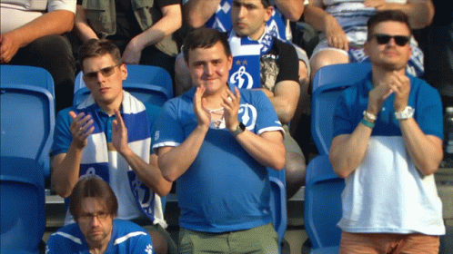 Dynamo Moscow football fans clapping and showing emotion during a match in the stadium.